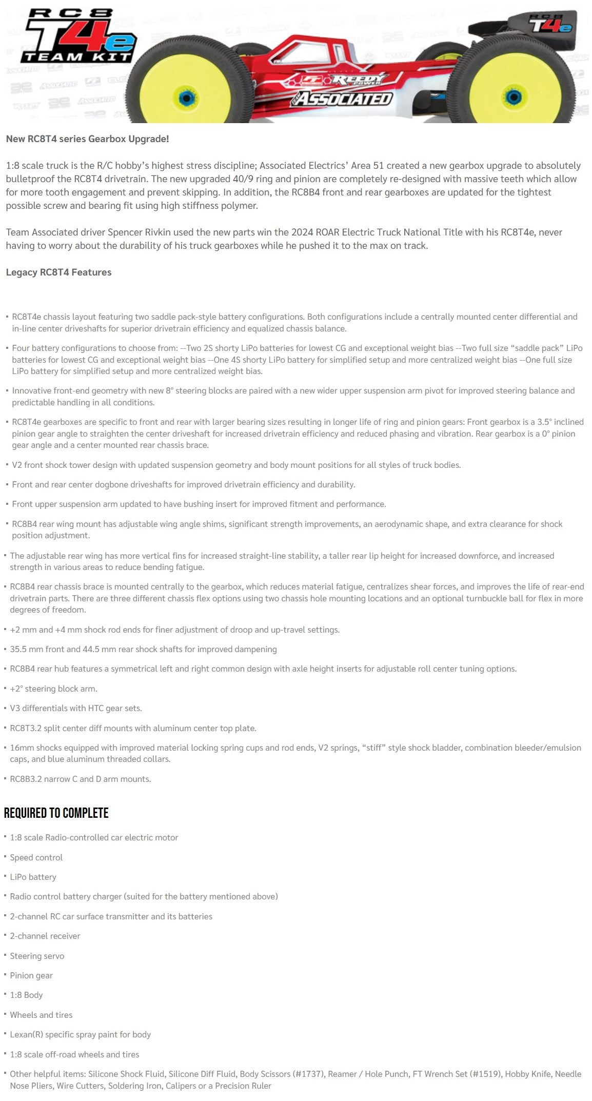 Team Associated RC8T4e Team Competition 1/8 4WD Off-Road Electric Truggy Kit w/Gearbox Upgrade