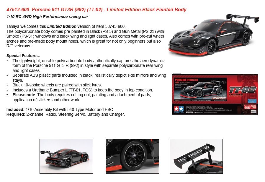 Tamiya TT-02 Porsche 911 GT3 R (992) RC Kit - PRE PAINTED Black