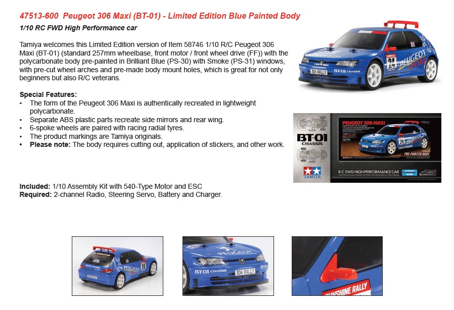 Tamiya BT-01 Peugeot 306 Maxi RC Car Kit - Pre Painted Blue