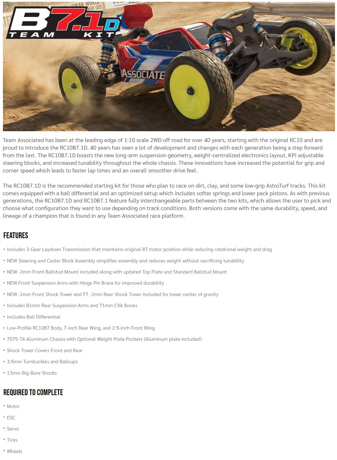 Team Associated RC10B7.1D Team 1/10 2WD Electric Buggy Kit (Dirt & Clay)